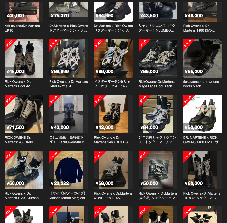 自分自身は純粋にドクターマーチンとRickOwensが好きなので転売はしませんが、現時点で「中古状態」であっても、定価以上の価格で売れています。