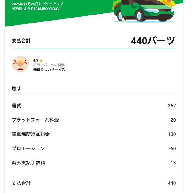正直あまり日本と物価が変わらないのがあり、タイの現地の人たちの平均月給9万-11万くらいを考えると超VIPな乗り物であるとおもいました。