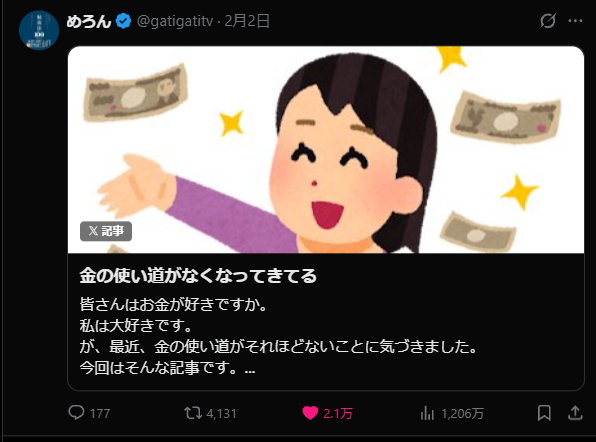 この記事を書こうと思ったきっかけは、X(旧Twitter)で4000リポストもされていて大きな反響を呼んだ「最近、お金の使い道がない」という投稿です。