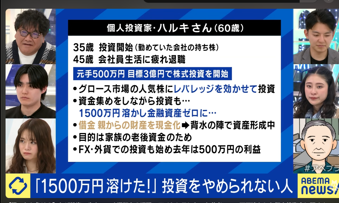 さらに、もう一人登場人物がいらっしゃって「ハルキ」さんという男性が45歳の時に株式投資で1,500万円を溶かし、金融資産をゼロにした人も登場されています。「マリュリュ」さんに辞めとけとアドバイスをするのかと思いきや、まだ続けられています。