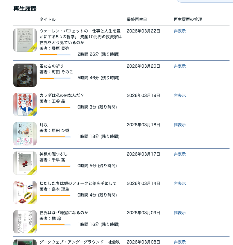 ご覧の通り普段からAudibleをかなりのペースで使っていて、ジャンル問わずかれこれ50冊以上は聴いてみたんですが、正直かなり相性が悪いと感じました。