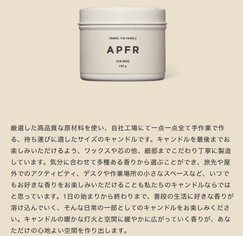 「APFRを購入した理由」はいわゆるジョーマローンやディプティックなど有名どころの「THE・高島屋」感や「定価に対し大幅に広告料が乗せられてるブランド」から少し離れたくて本物志向に目覚めたからです。