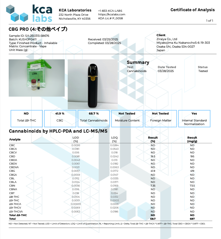 KUSH JPの製品は、第三者機関による成分分析証明書(COA)が公開されています。