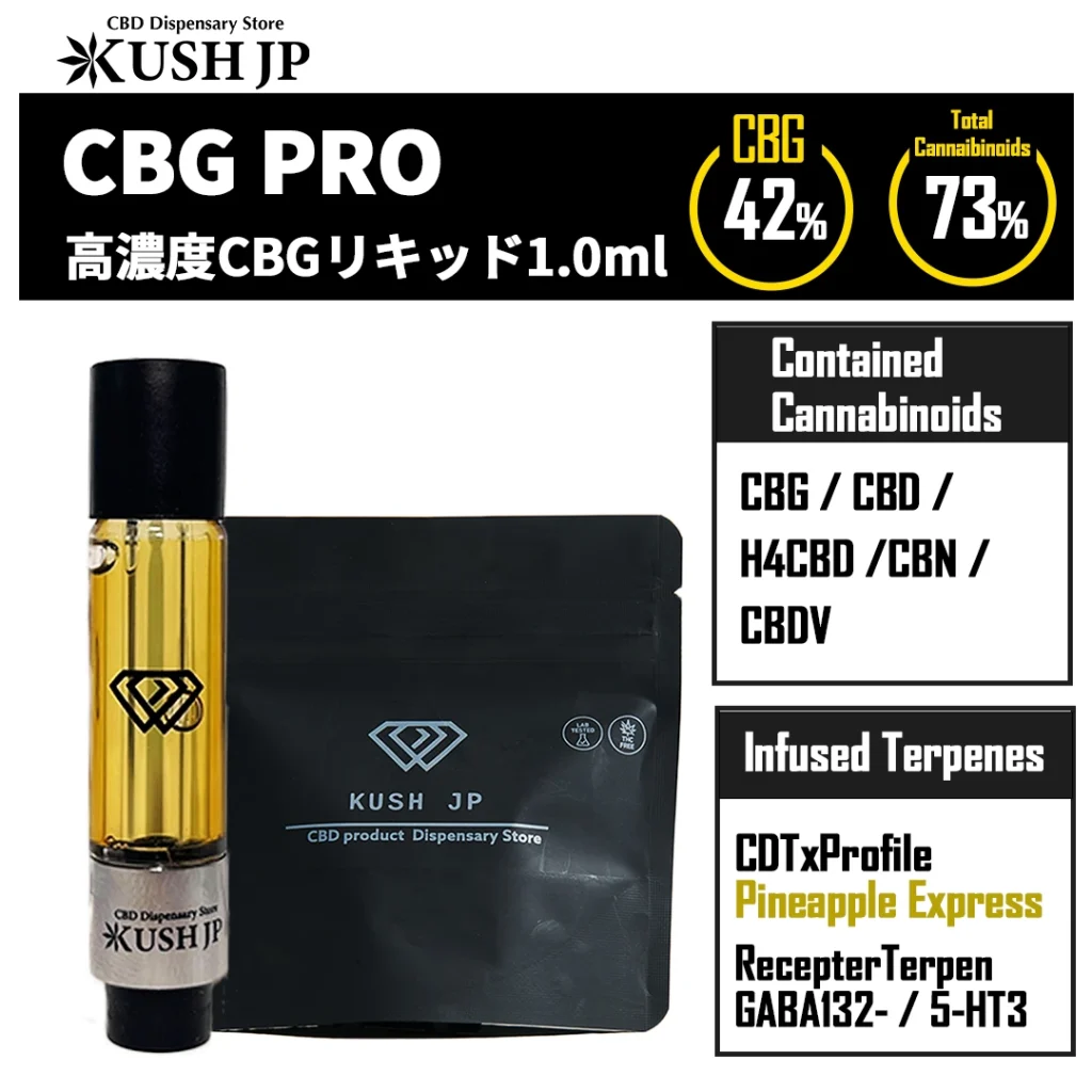 KUSH JPの「CBG PRO」はこれらが絶妙なバランスで配合されているため、成分同士の相乗効果(アントラージュ効果とよく呼ばれるものです)もしっかり期待できる作りになっています。