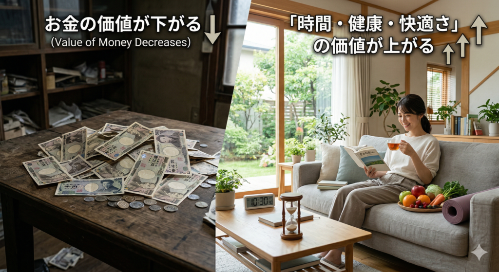 お金の価値が下がるというより、「時間・健康・快適さ」の価値が上がる