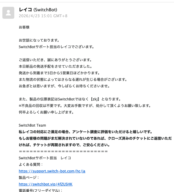 仮に自分が企業側だったら、内心では「2日前に言ってくるんかい」と思ってしまいそうですが、SwitchBotのサポートはそんな空気を一切出さず、終始かなり丁寧に対応してくれました。