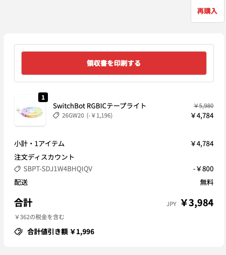 そしてその後、もう1台SwitchBotのテープライトを購入しました。